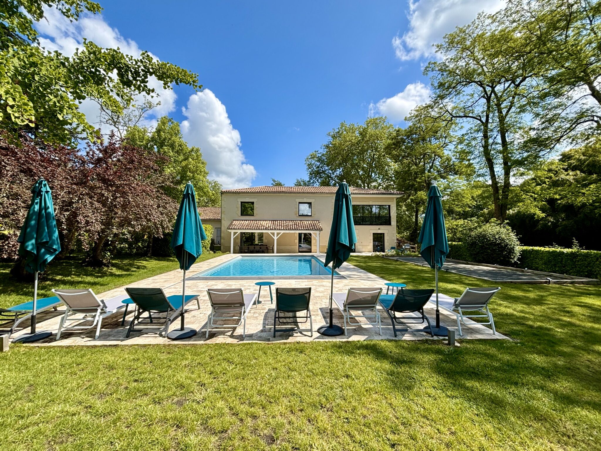 Nestled on a working wine estate just 40 minutes from Bordeaux, your five-bedroom villa blends rustic charm with refined comfort. Stone walls, exposed beams, and wide windows frame sweeping vineyard views that shift with the light — from misty mornings to sunsets awash in gold. Enjoy breakfast on the terrace, relax by the pool as cicadas sing, and share stories under a canopy of stars. With spacious living areas, private en-suite bedrooms, and a serene countryside setting, this villa invites you to live like a local – slowly, beautifully, and completely at ease. Final cleaning and utilities included.
