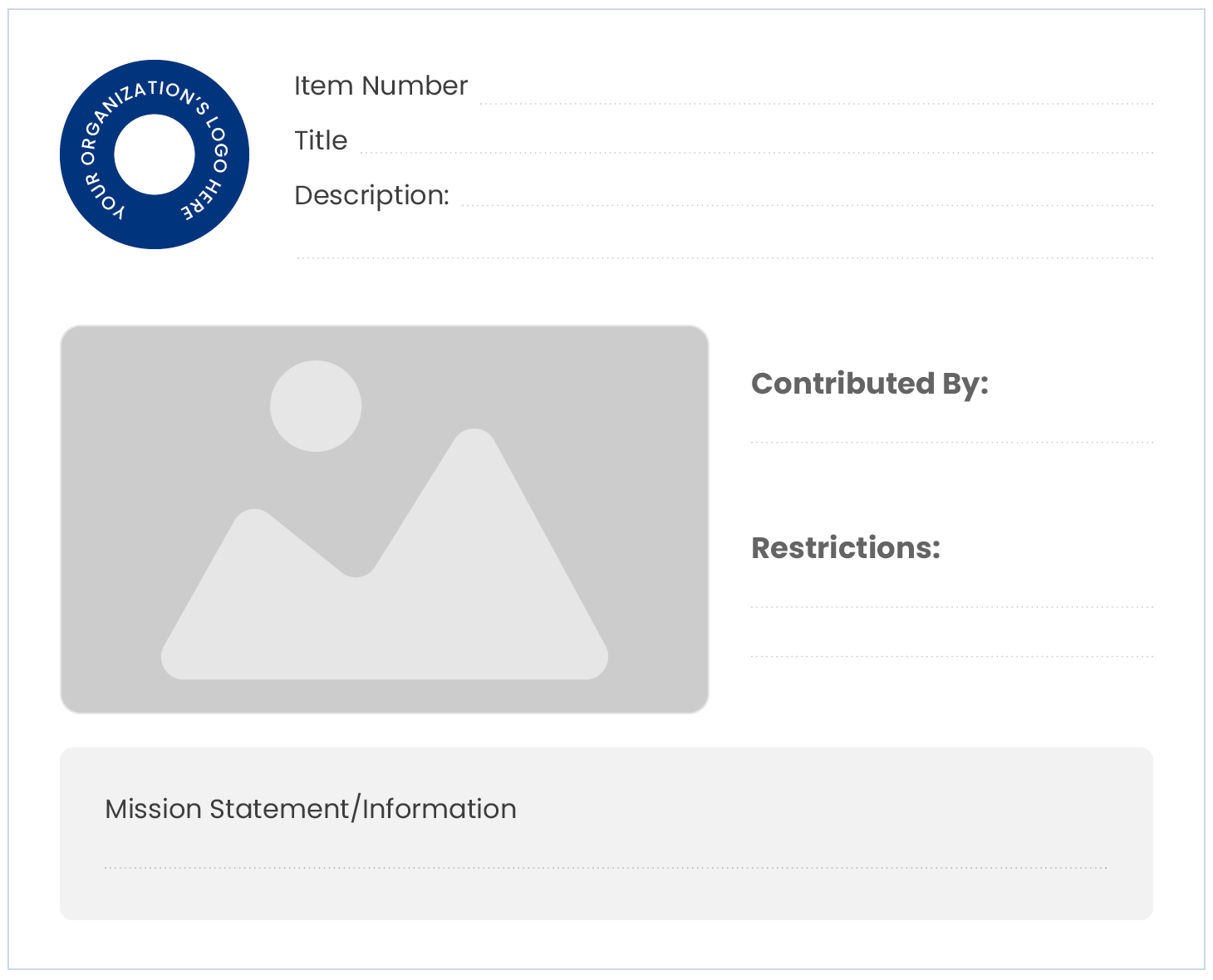 To make it easy to create professional-looking, consistent display sheets with thorough item descriptions, here is a template you can adapt for your nonprofit’s needs: